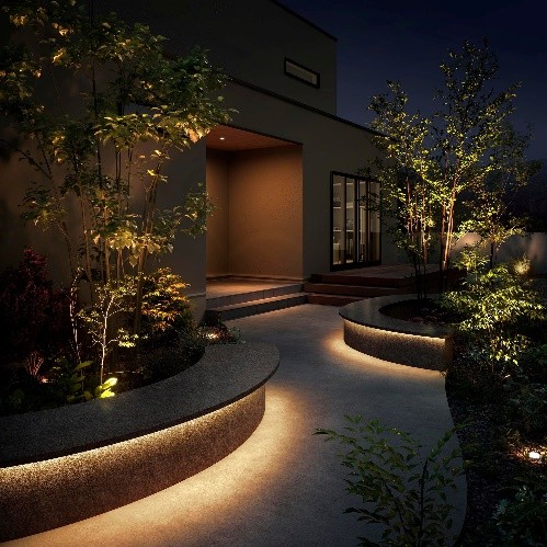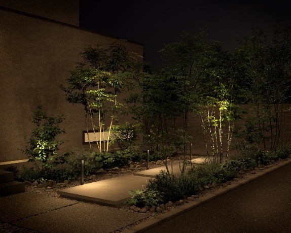 照明によって植物の立体感や季節の移ろいを感じられるようになり、夜の庭が特別な空間に変わります。ライトアップされた植栽は、窓からの眺めにも癒しを与えてくれます。